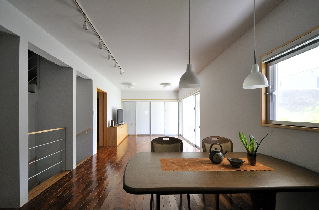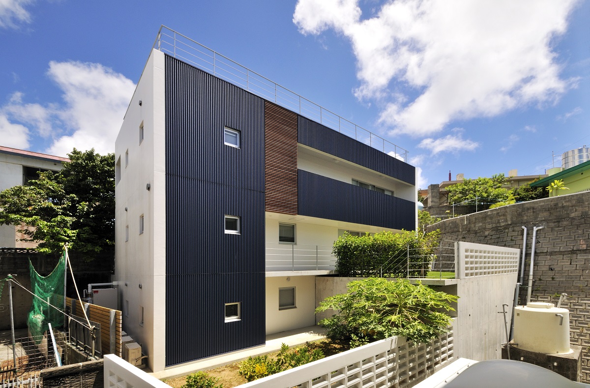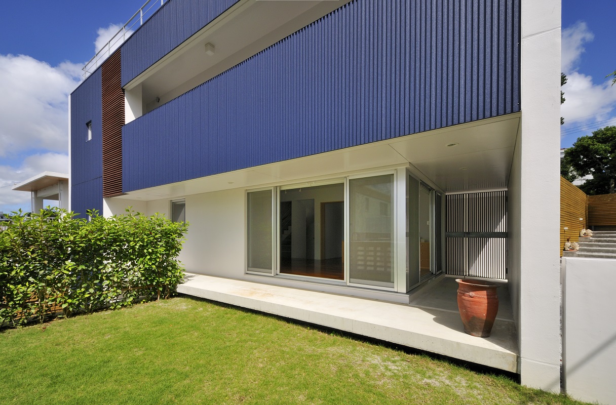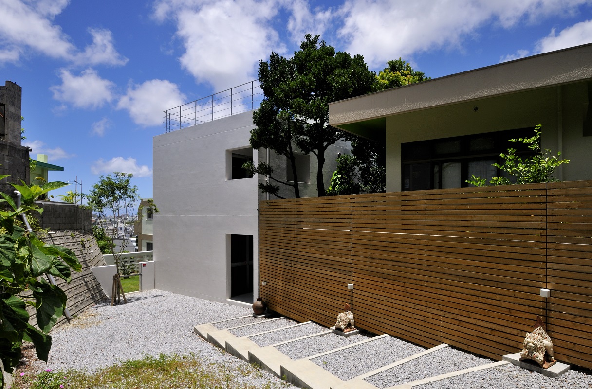 豊見城の住宅街、那覇の市街地を臨む敷地に建つ住宅。 傾斜が厳しい敷地に対し、高低差のある庭を設け、敷地全体を建物を含め立体的に活用できるよう計画を行った。また、3層に渡る吹抜を階段に沿うように設け、建物全体に風が抜けるよう考慮した。