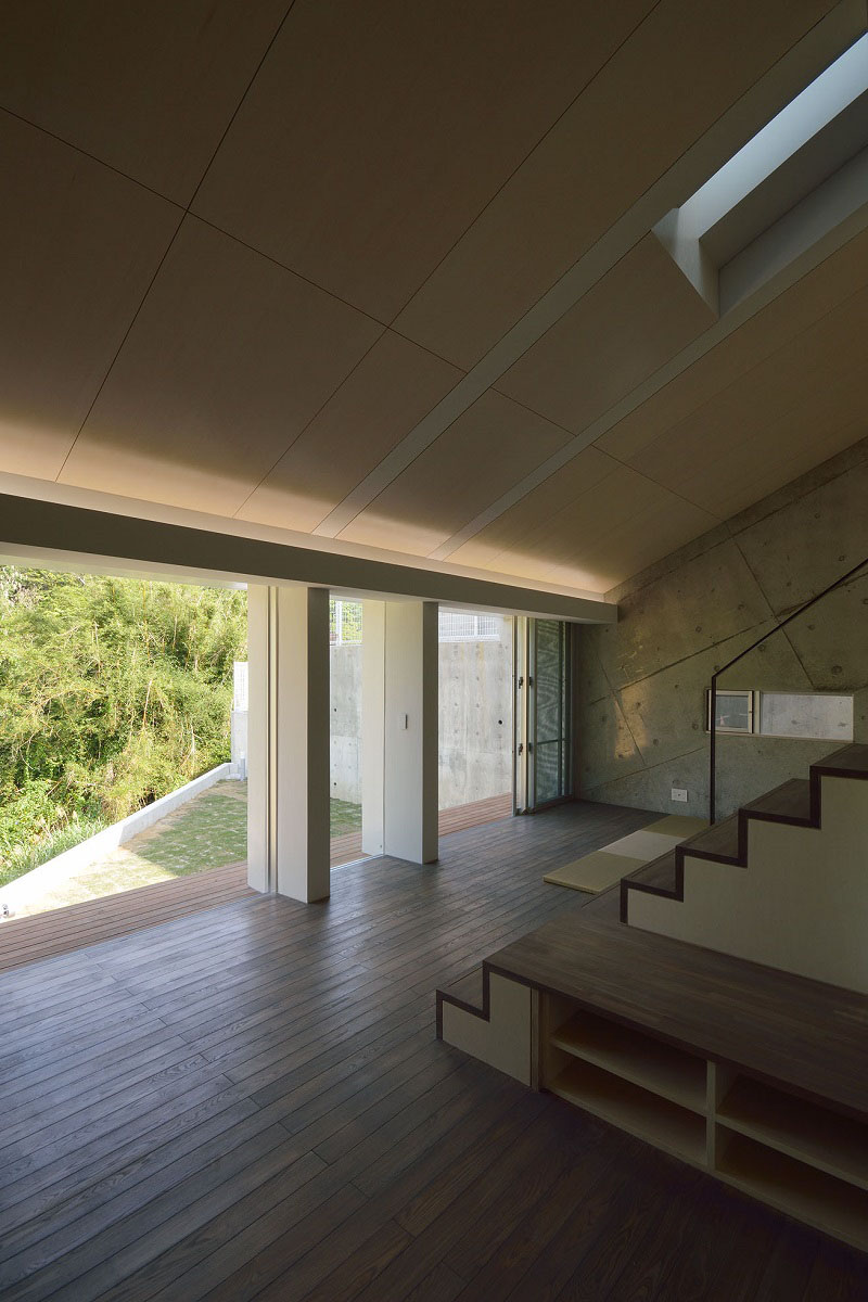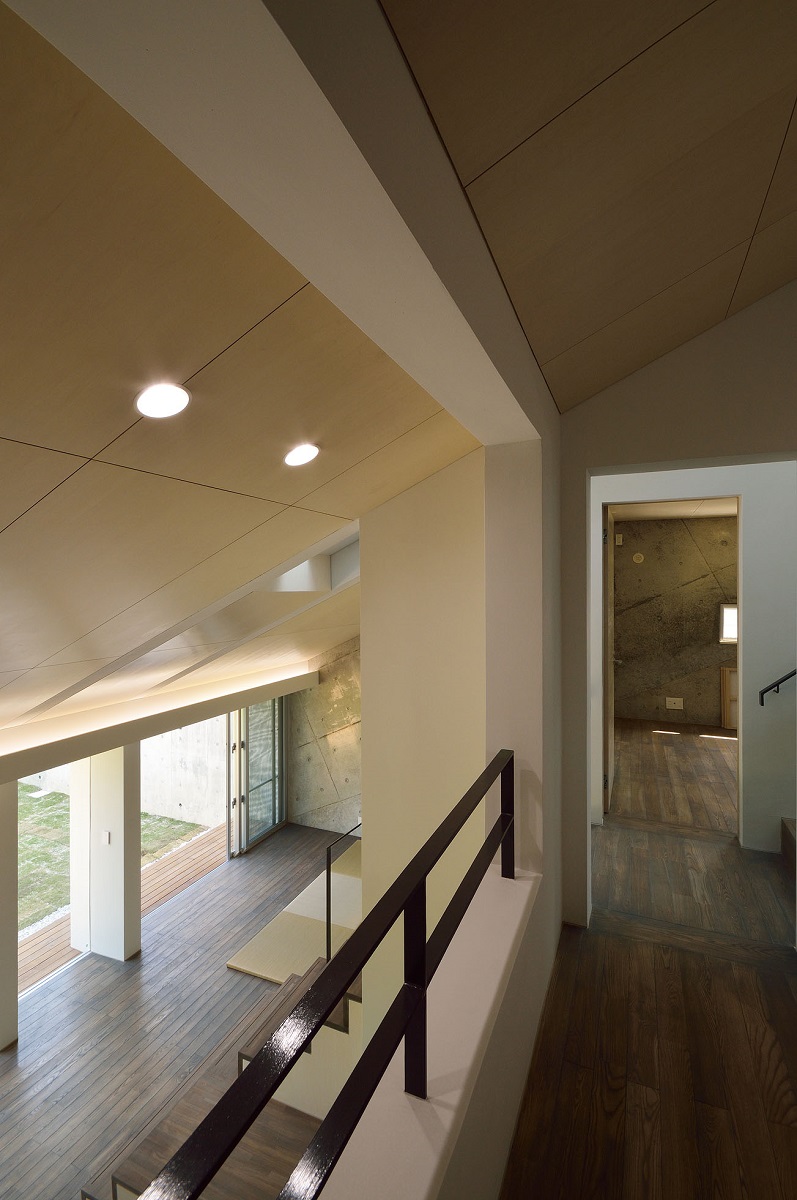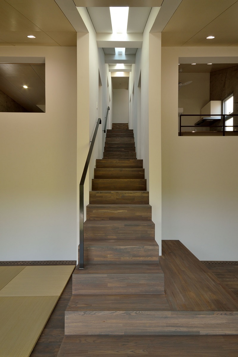 自然豊かな分譲地に建つ住宅。敷地や周辺環境の持つコンテクストを住宅内部にも展開し、熱環境をコントロールできるような住宅の在り方を考えた。スキップフロアが連続するようなワンルーム空間とし、空気や音、気配が伝わるよう計画している。また、部屋の用途を限定せず時間や季節、生活スタイルの変化にも対応できる空間づくりを目指した。