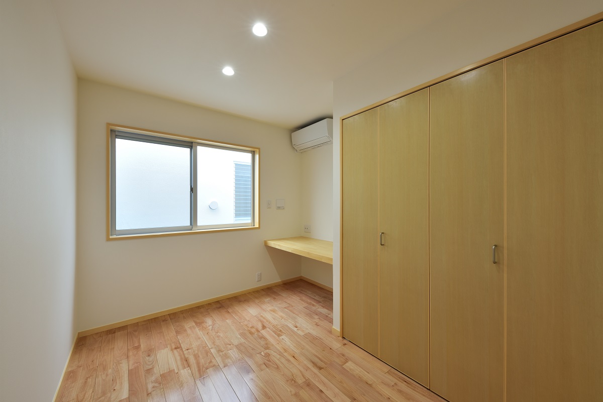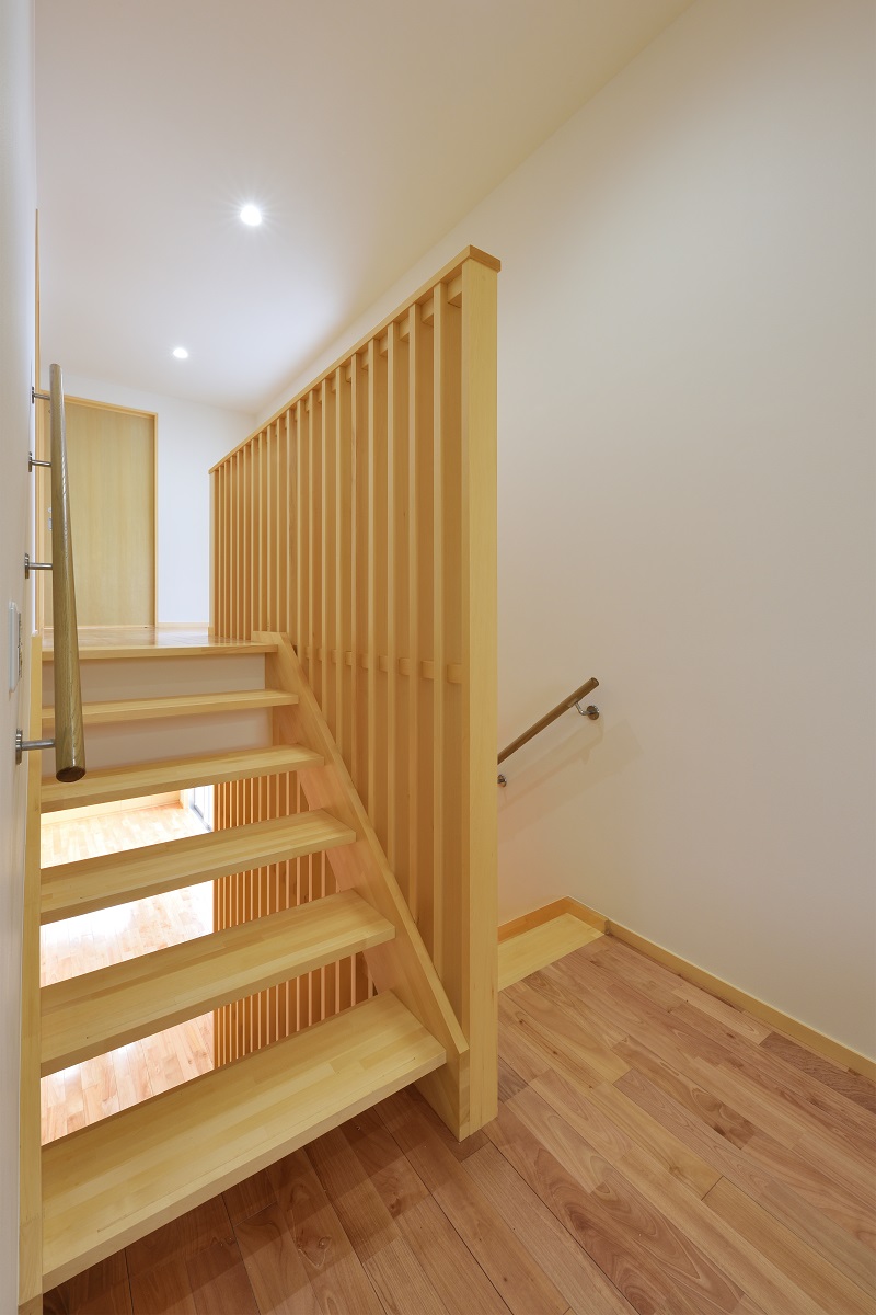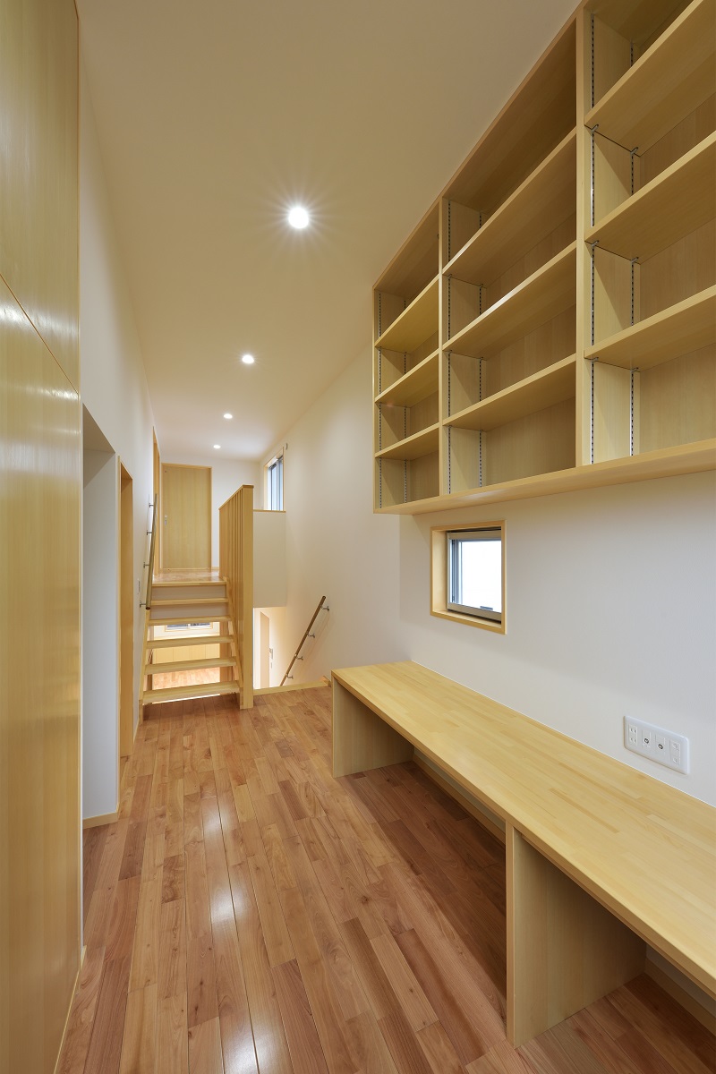 敷地は密集地ながら角地であるため建築面積を最大化しつつ、道路との距離感に配慮しながら計画を行った。1階はリビング・ダイニングに目隠し付きのテラスを併設し、拡がりのある団欒空間とした。家族の誰もが利用できる書斎とユーティリティーを個室のある2階との中間階に設け、お互いの気配を感じられるよう計画した。防犯や西日対策として開口部は小さくしつつもテラスや書斎空間が運ぶ光や風によって健康的な住居環境となっている。