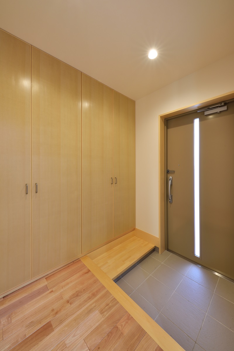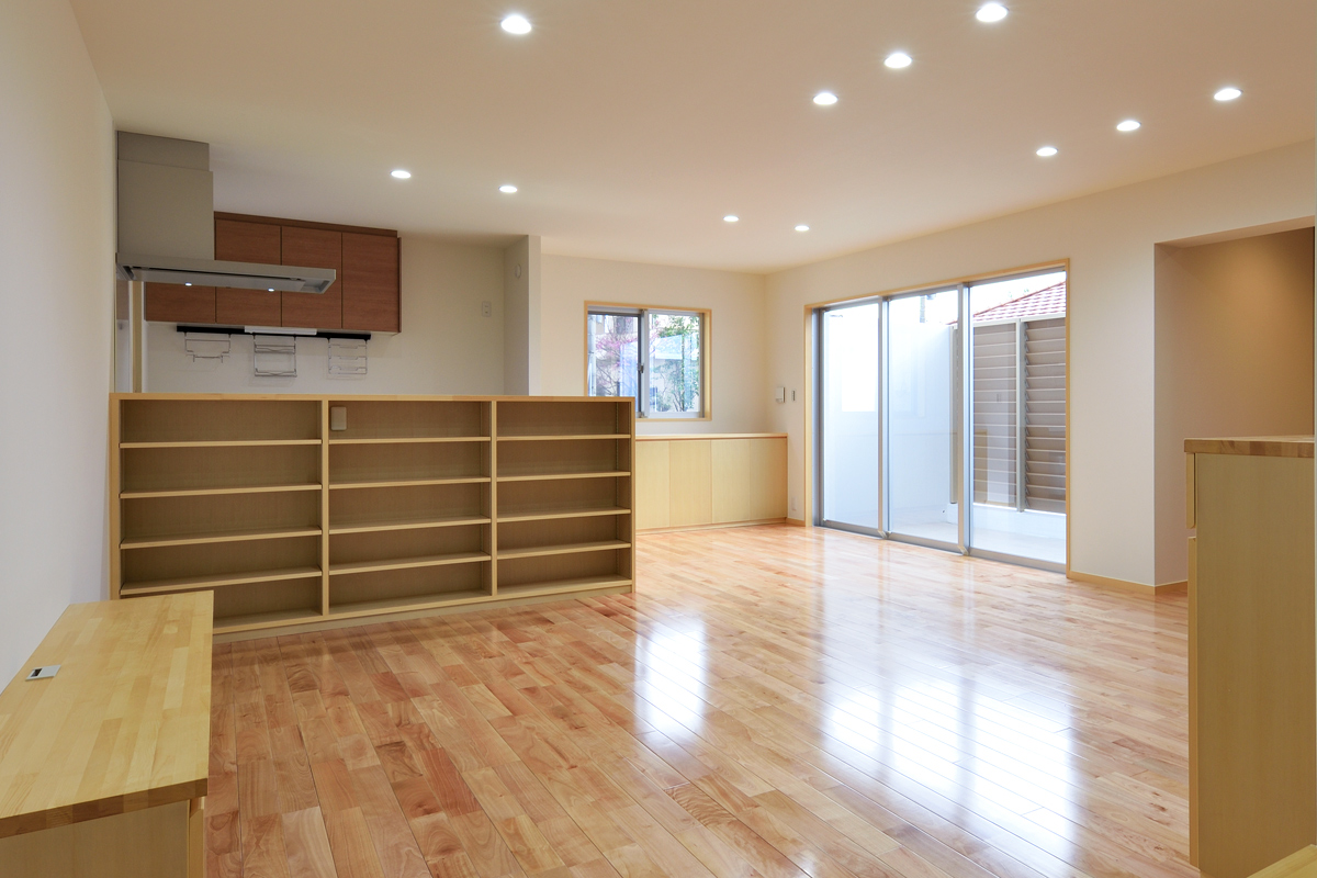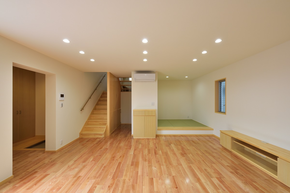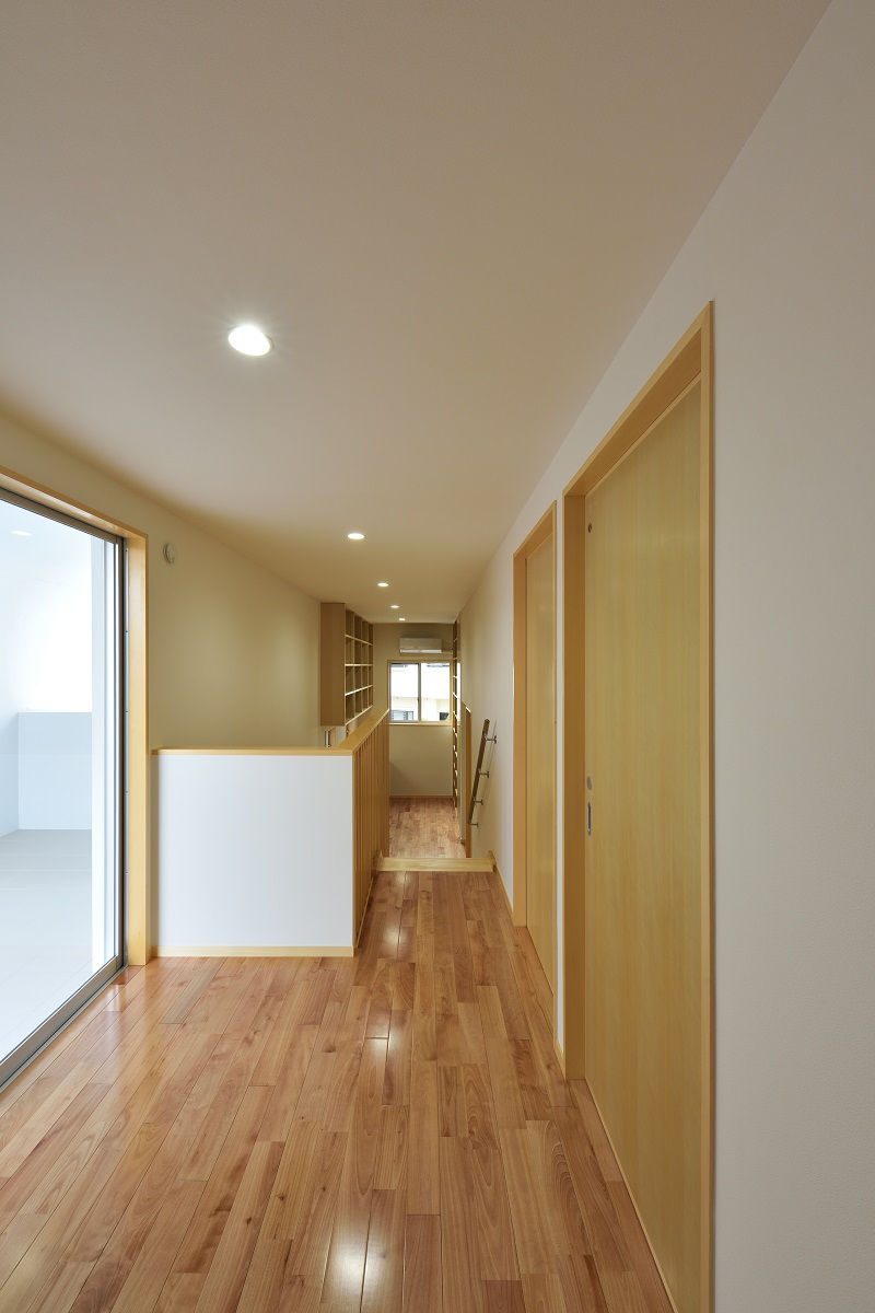 敷地は密集地ながら角地であるため建築面積を最大化しつつ、道路との距離感に配慮しながら計画を行った。1階はリビング・ダイニングに目隠し付きのテラスを併設し、拡がりのある団欒空間とした。家族の誰もが利用できる書斎とユーティリティーを個室のある2階との中間階に設け、お互いの気配を感じられるよう計画した。防犯や西日対策として開口部は小さくしつつもテラスや書斎空間が運ぶ光や風によって健康的な住居環境となっている。