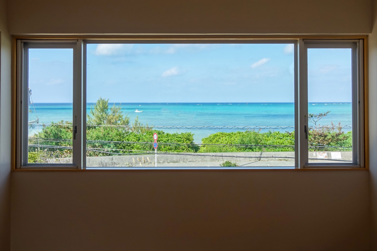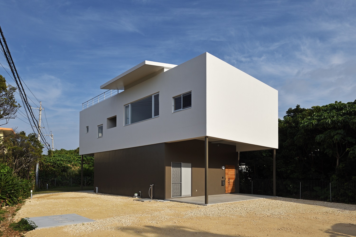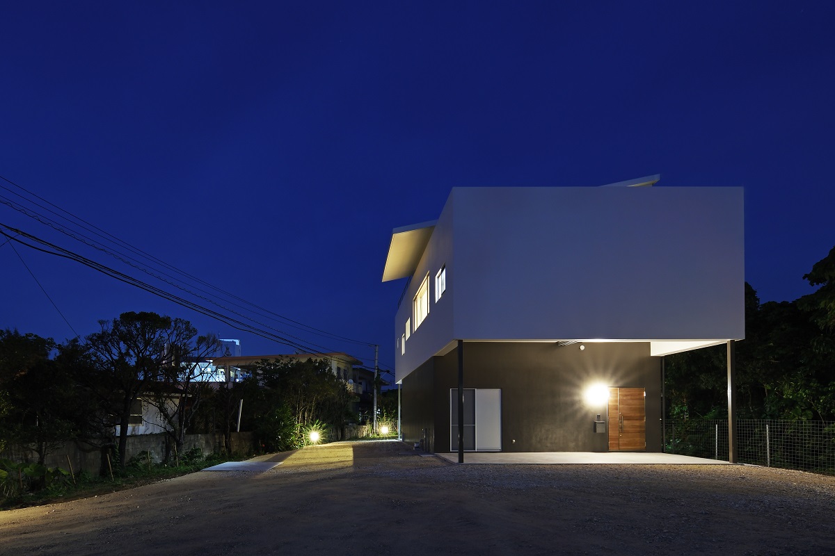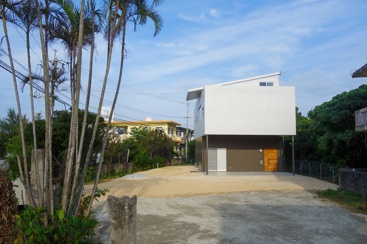 敷地の目の前には、道路を挟んでエメラルドグリーンの海と白砂のビーチが広がっている。しかしグランドレベルでは電線や保護林によってビューが期待できないため、リビングをはじめ生活のほとんどのスペースを通常の2階より少し高いレベルに持ち上げ、最高のビューを確保した。各部屋には台風や防犯に考慮しながら、周辺の景色を取り込むための窓をそれぞれ設けている。