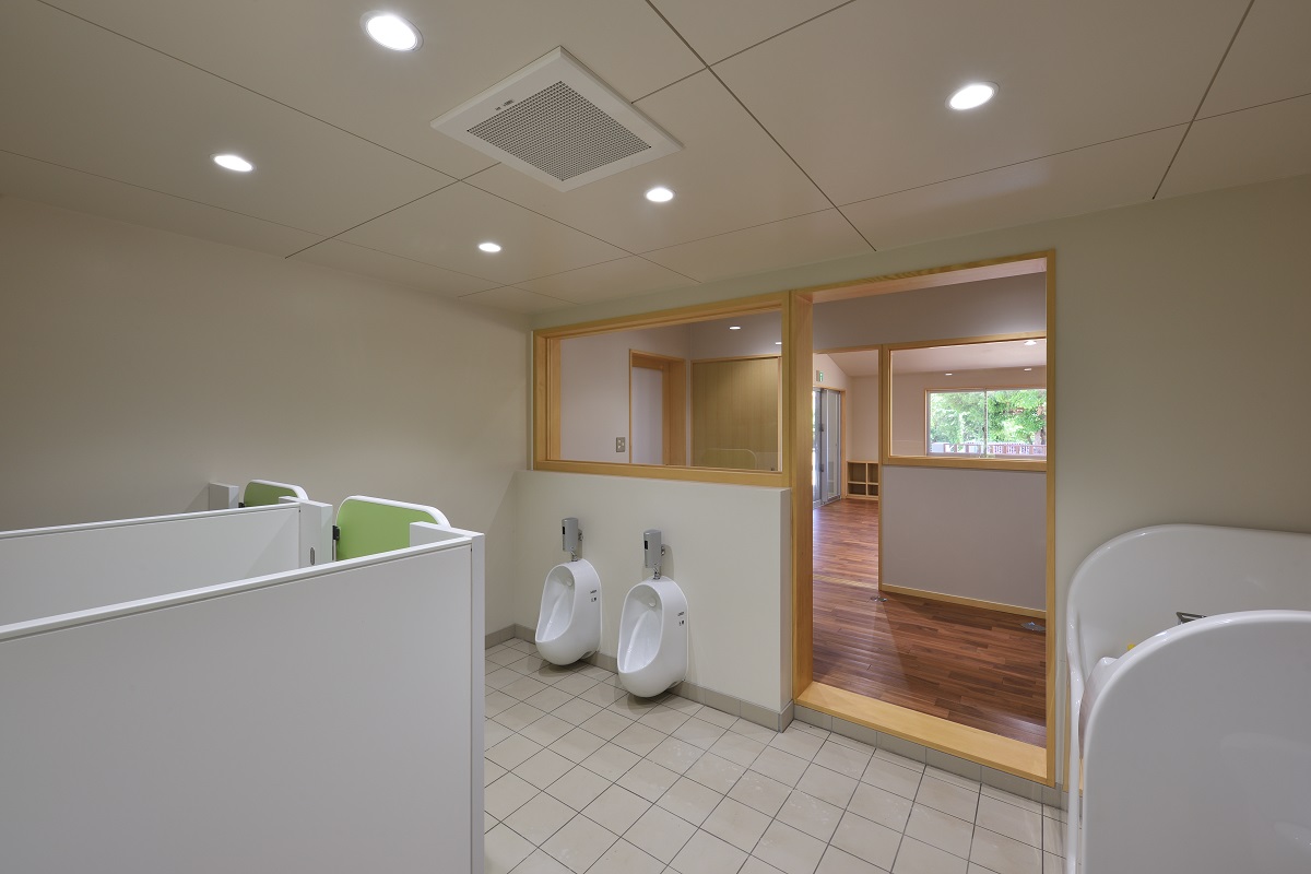 前面に大きく広がる園庭に大きく庇を伸ばした縁側を配置し、子供たちが室内外を自由に行き来できるよう室内外の連続性を重視した。