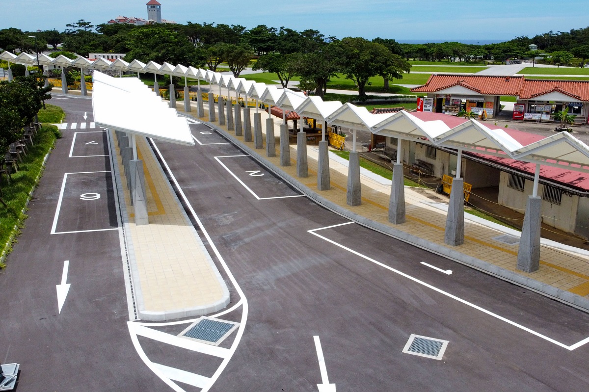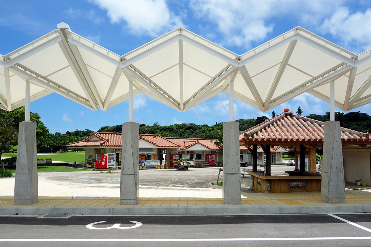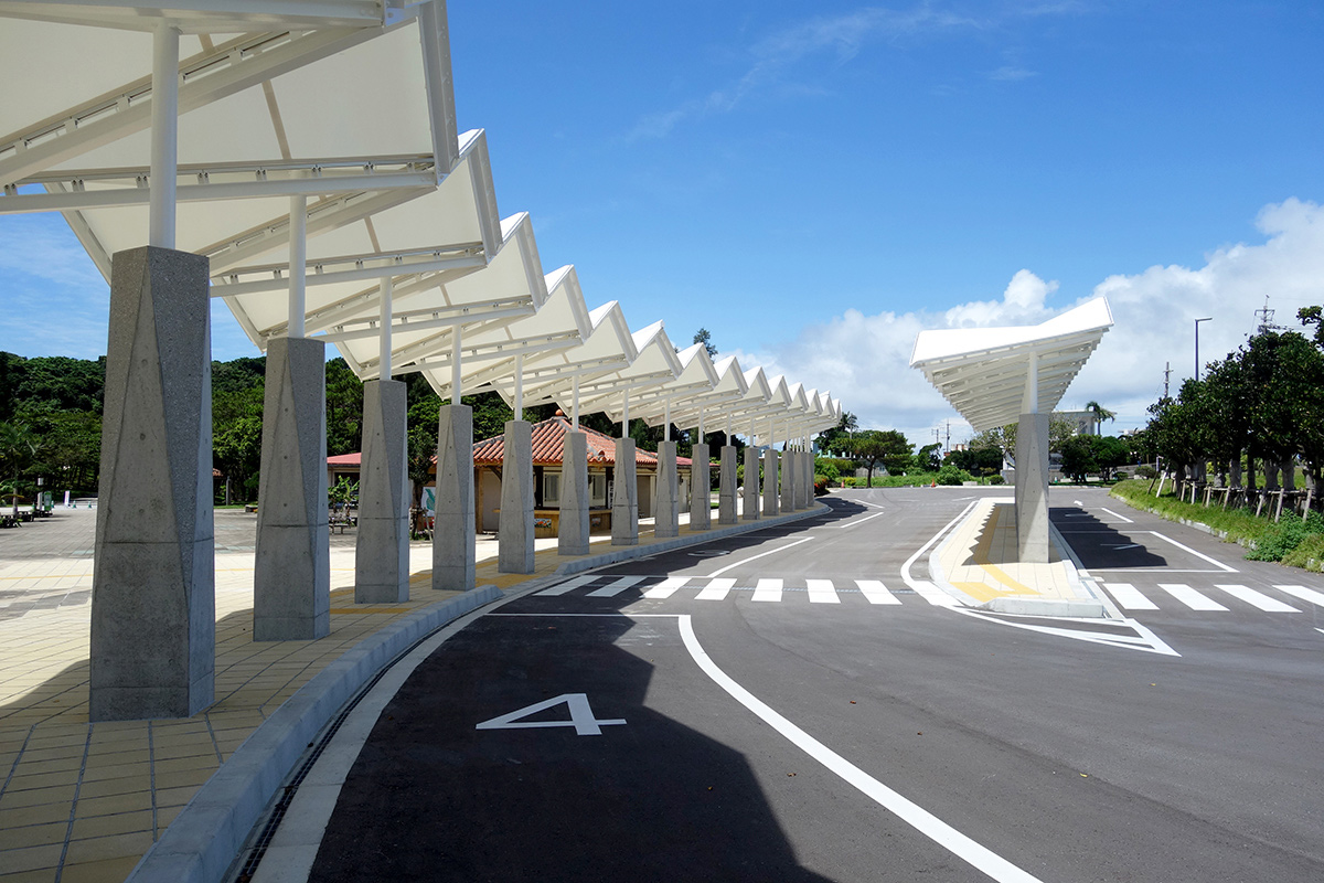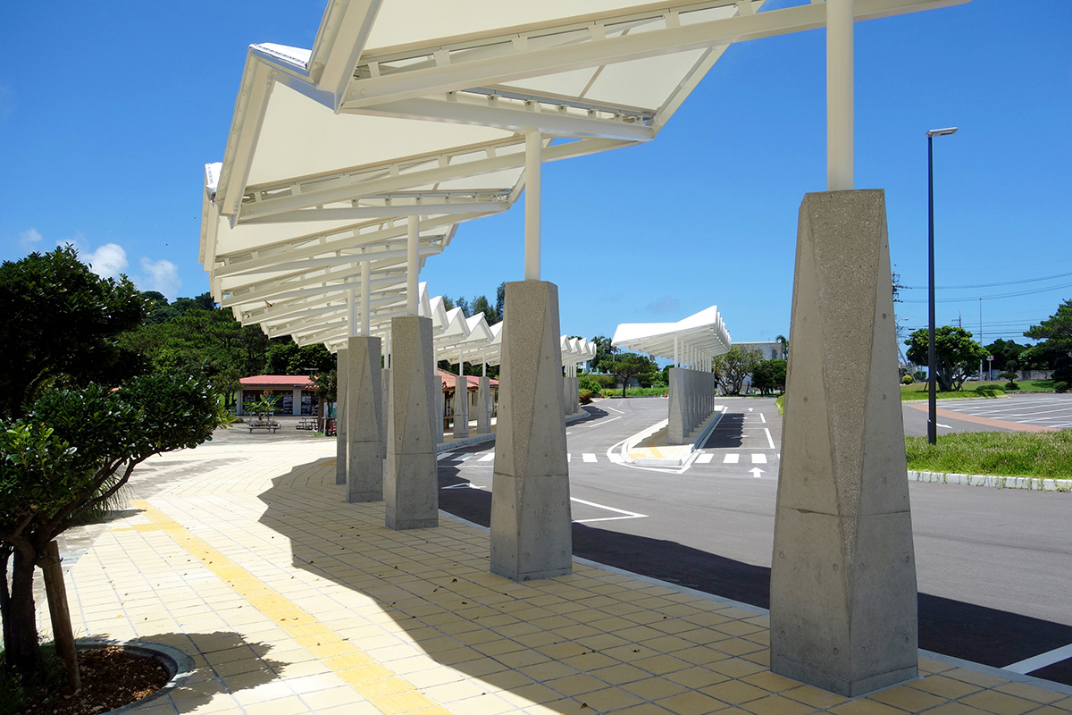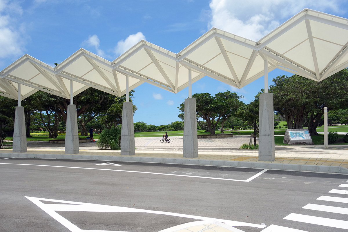 大型バスで来園する観光客を出迎え、乗降時の日射しや雨の降込みを防ぐための屋根を設けている。『平和の形』を表現するため、折り紙をモチーフに繊細で軽快な屋根を膜構造でつくり、RCの根巻柱は力強さと繊細さを感じられる造形とした。公園内既存施設との調和と駐車場一帯のシンボル的な施設となることを目指した。