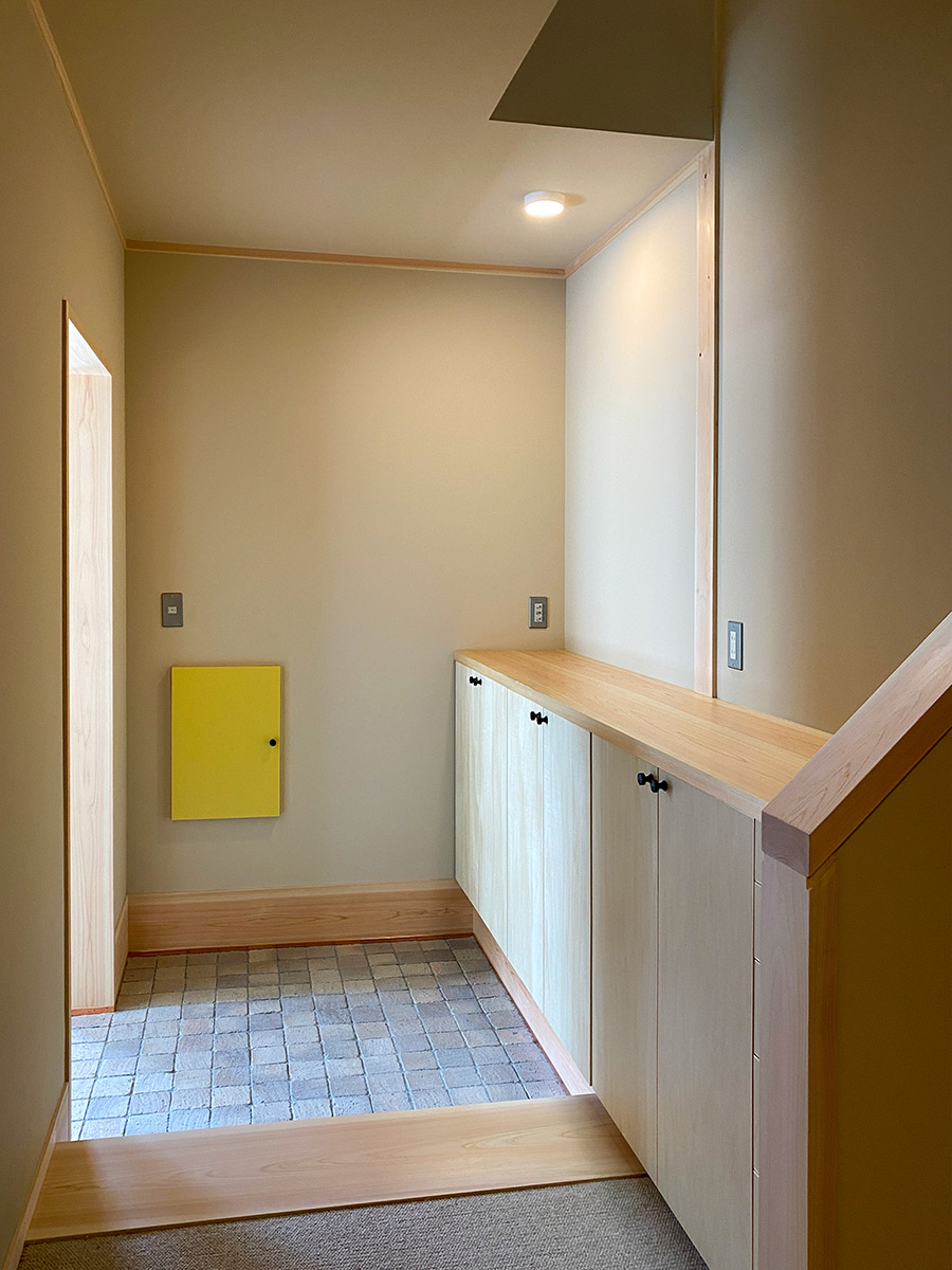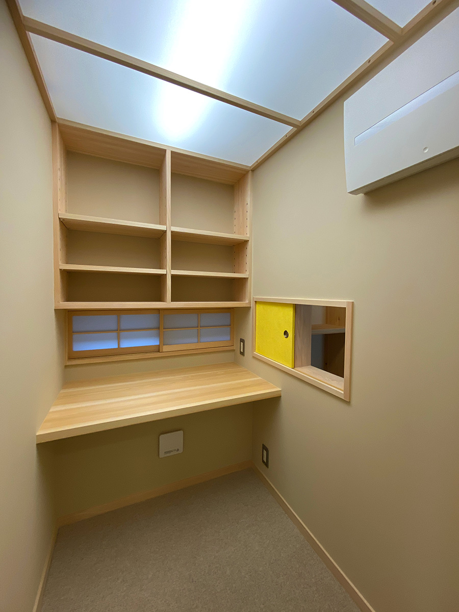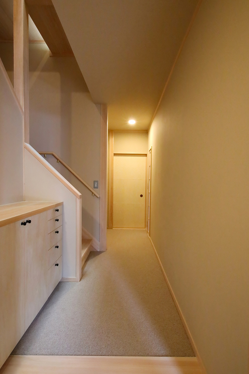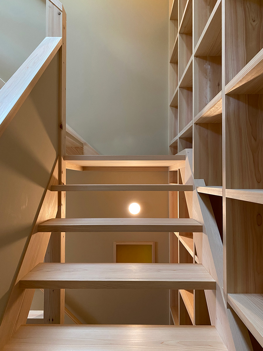 敷地は間口が狭く、細長い。道路側から奥に行くに従って地盤レベルが高くなっていく。周辺の土を建物で受けるため1F部分をコンクリート、上部二層を木造の混構造としている。本棚を併設した階段を中心に諸室を配置。2F南面のリビングはバルコニーと上階へつながる吹抜けによって広がりを感じられる空間とした。最上階の個室は屋根勾配を生かした構成となっている。