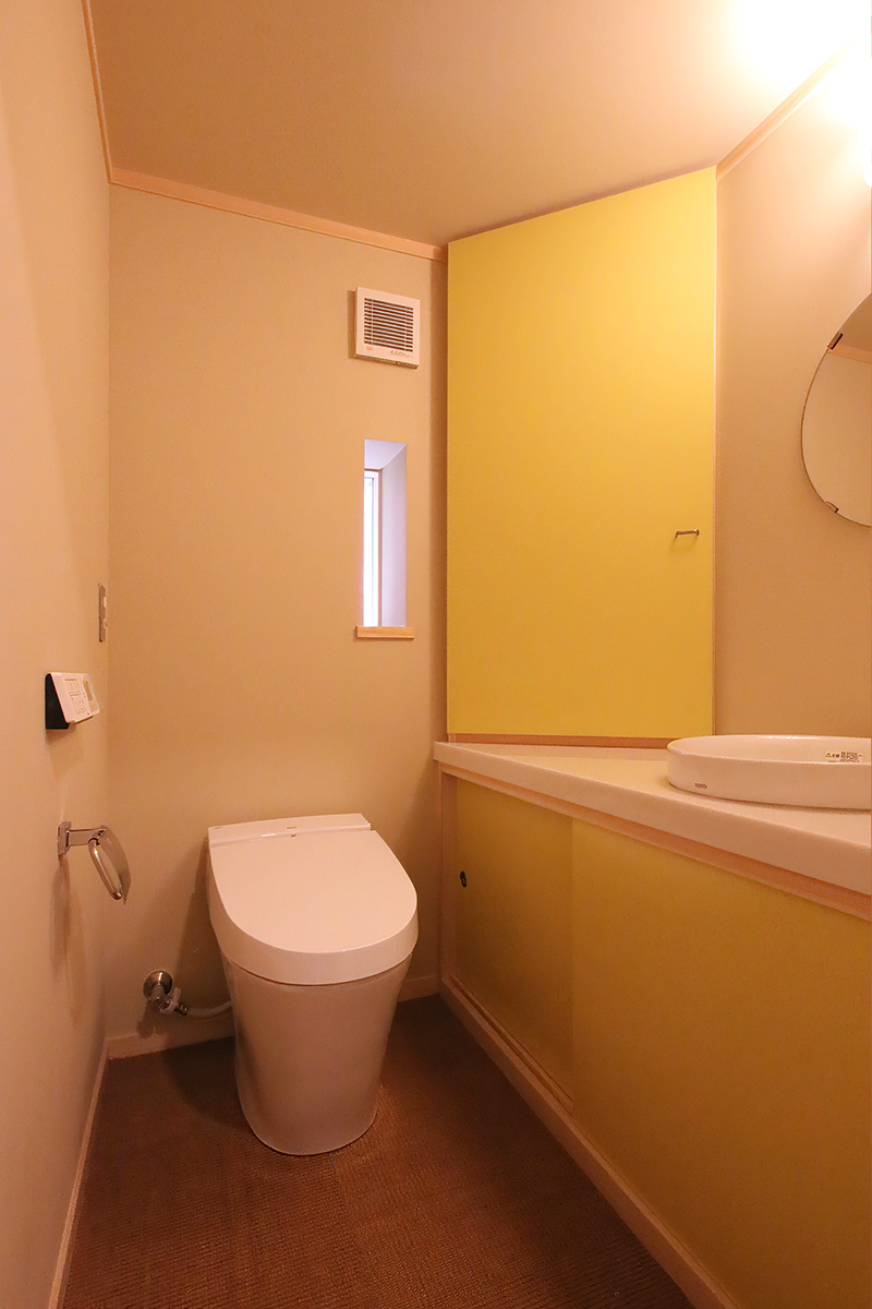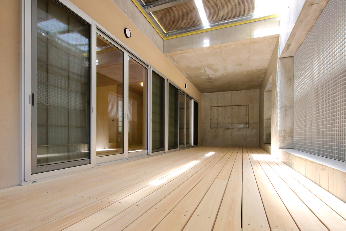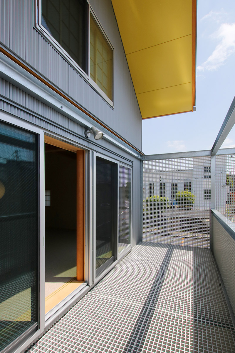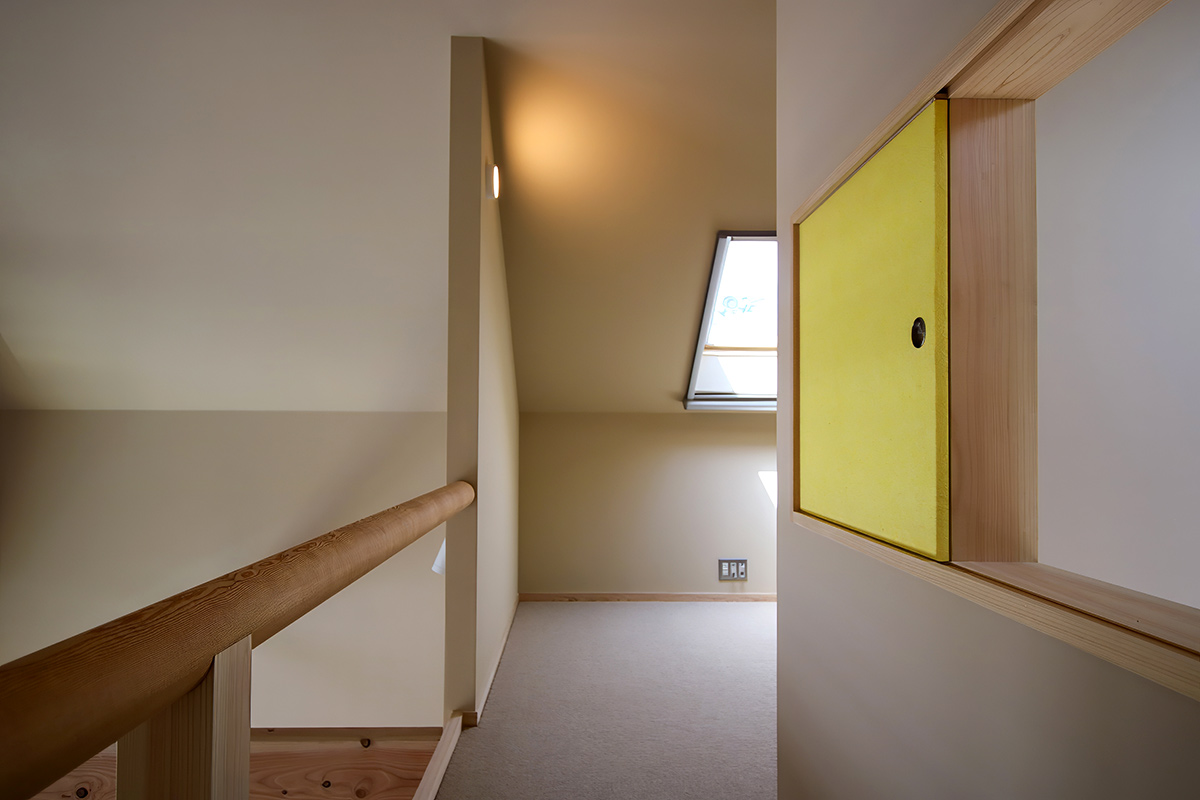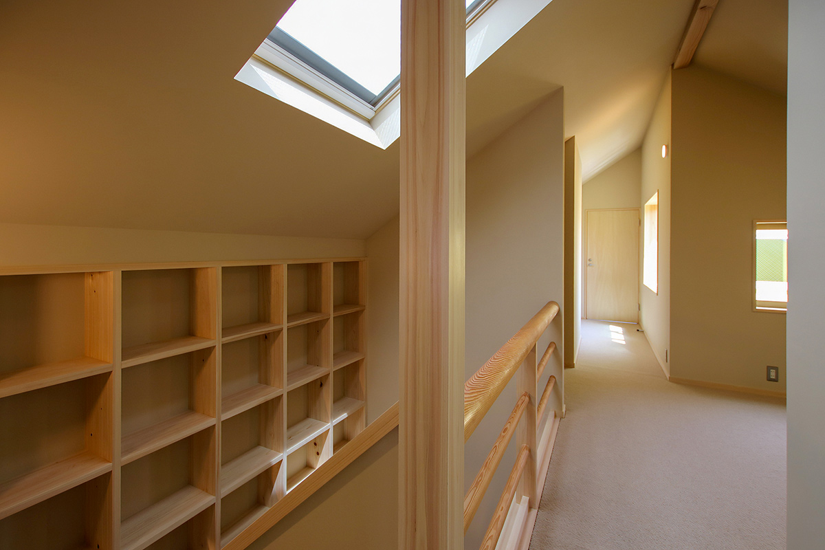 敷地は間口が狭く、細長い。道路側から奥に行くに従って地盤レベルが高くなっていく。周辺の土を建物で受けるため1F部分をコンクリート、上部二層を木造の混構造としている。本棚を併設した階段を中心に諸室を配置。2F南面のリビングはバルコニーと上階へつながる吹抜けによって広がりを感じられる空間とした。最上階の個室は屋根勾配を生かした構成となっている。
